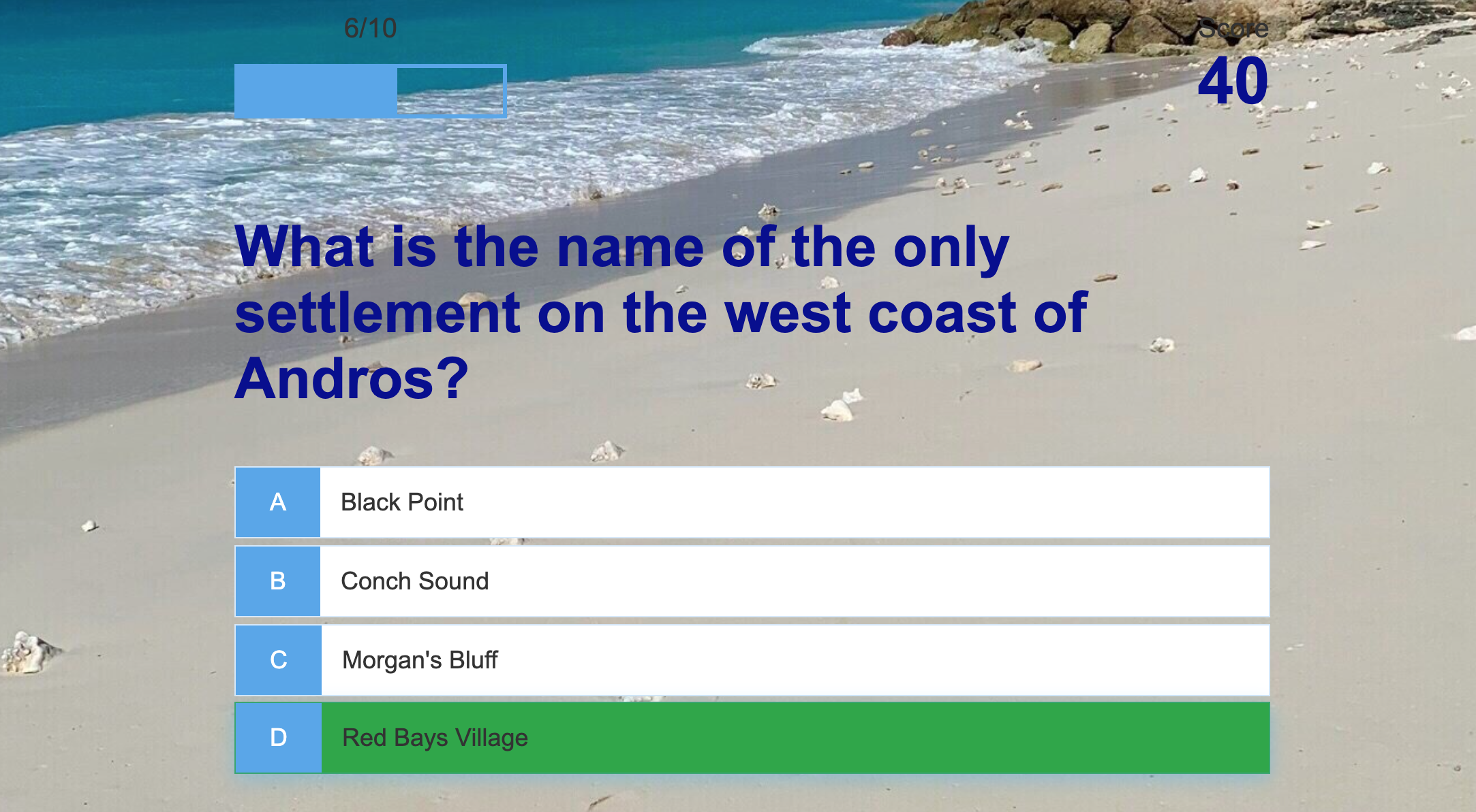 “Where We Gern?” is a trivia game to educate users on the rich and diverse culture of The Bahamas. In collaboration with expert historian, Alexis Clarke. It was made using pure HTML5, CSS and Javascript. The user tests their knowledge with Trivia on The Bahamian islands covered in Alexis’ website, Everything Bahamian. The Questions were loaded on to a separate .JSON file where once the Play button was clicked it would start a function that would call a random question out of the 21 loaded questions until the user has answered 10. Their correct answers are recorded and added to the user’s score. The Highest 3 scores have the opportunity to store their High Scores locally. The Github Repository below shows in depth through comments the reasoning and logic taken. The game itself is hosted as a Static Webpage via CloudFlare.